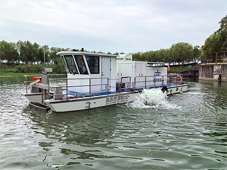 公司研發(fā)的加壓控藻船,以玻璃鋼船體為平臺(tái),配置藍(lán)藻打撈、壓力控藻和曝氣裝置...